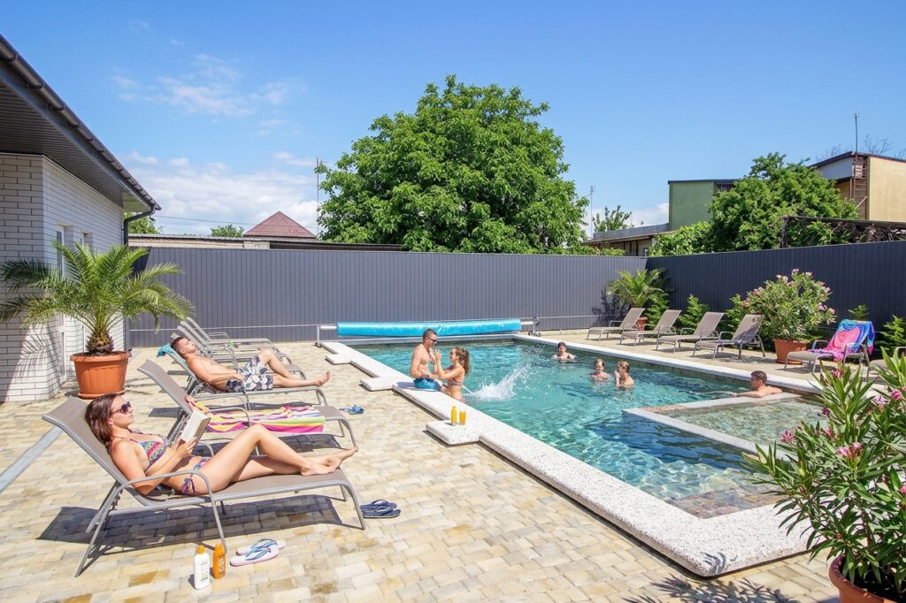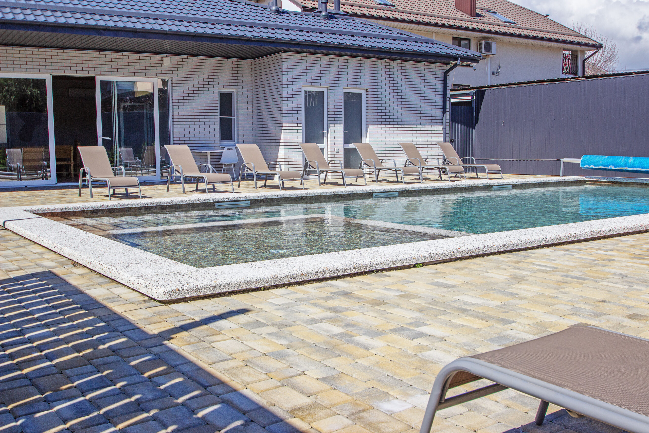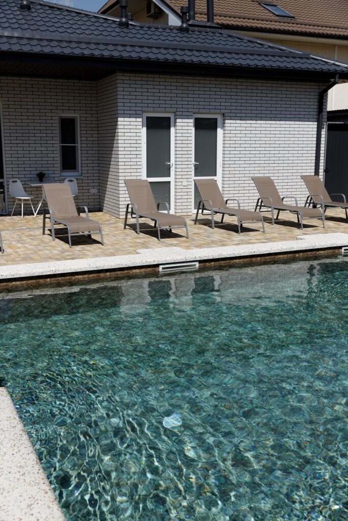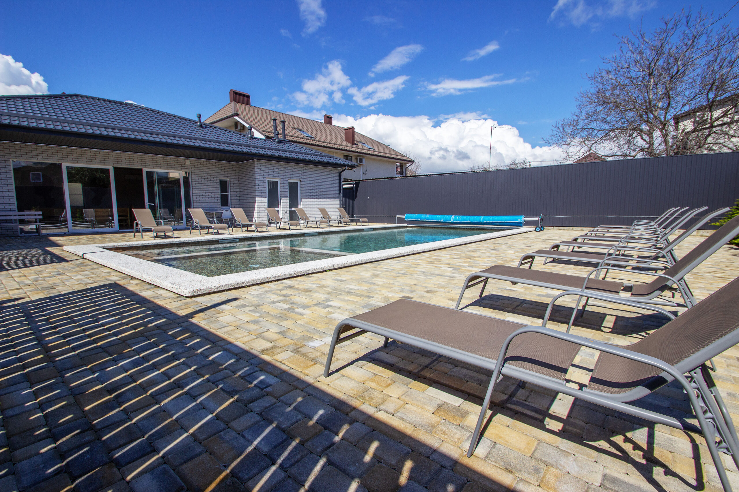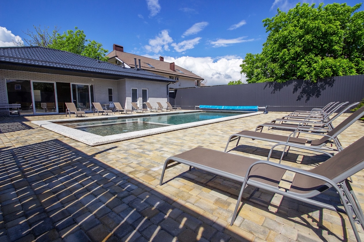 Особенностью является просторный бассейн, окружённый зелёной зоной отдыха. Здесь вы сможете расслабиться в тёплые солнечные дни, освежиться прохладной водой и зарядиться энергией солнца. Для вашего удобства рядом установлены шезлонги, столики и зонтик, чтобы отдых стал комфортным и приятным.