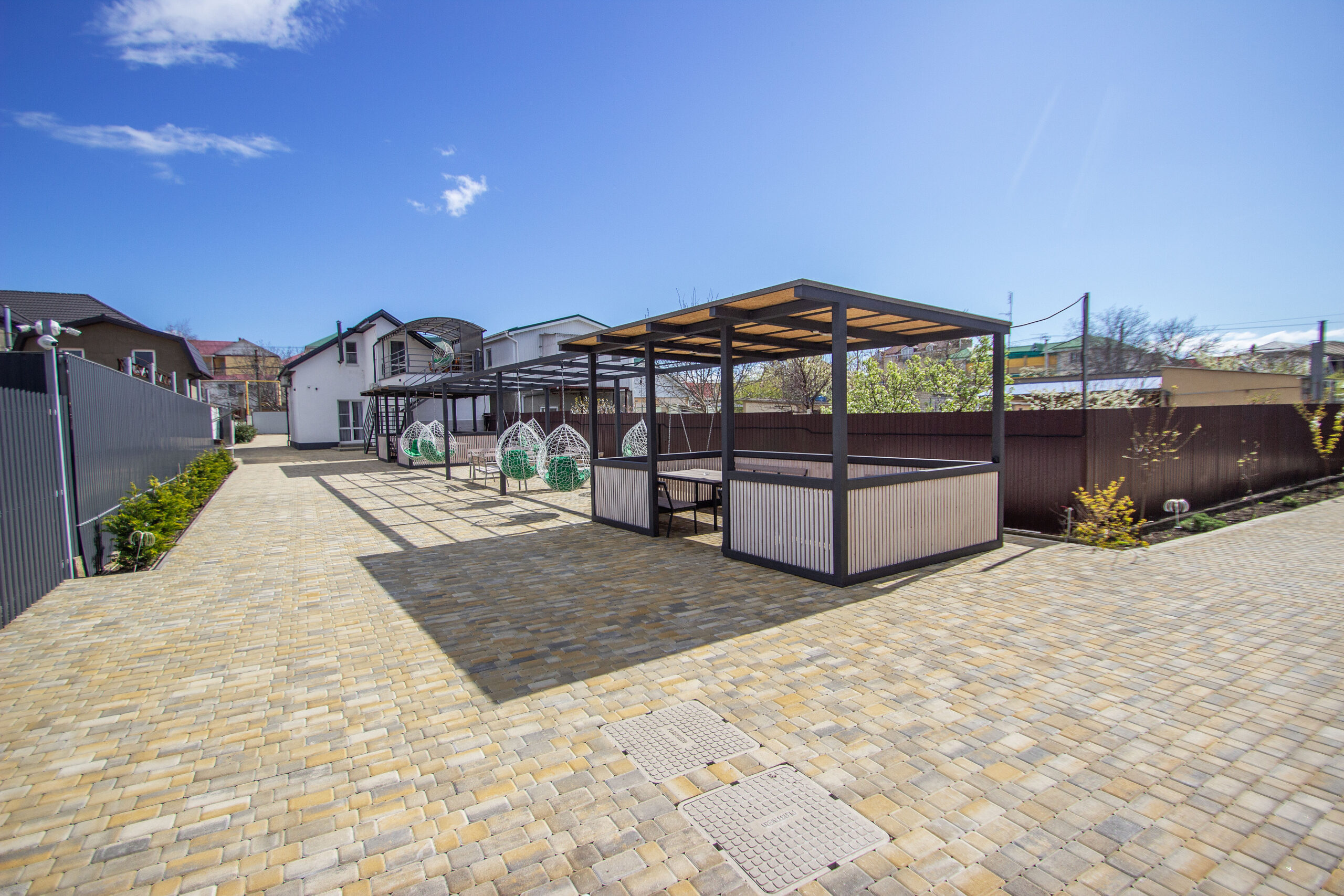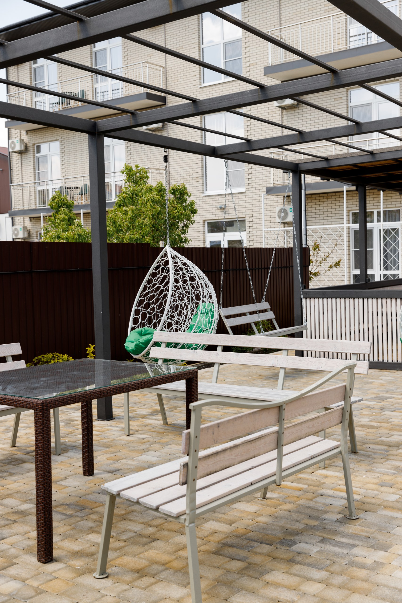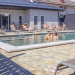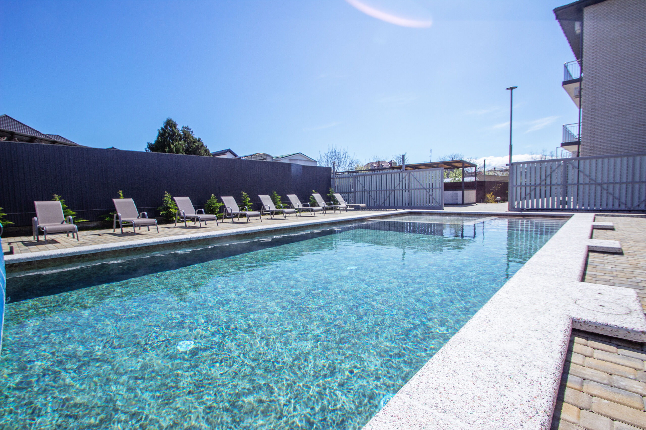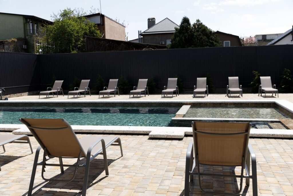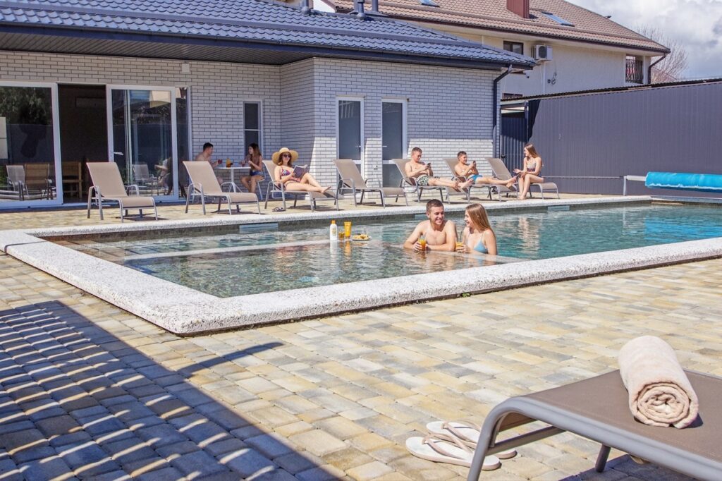 Особенностью является просторный бассейн, окружённый зелёной зоной отдыха. Здесь вы сможете расслабиться в тёплые солнечные дни, освежиться прохладной водой и зарядиться энергией солнца. Для вашего удобства рядом установлены шезлонги, столики и зонтик, чтобы отдых стал комфортным и приятным.