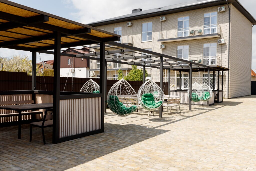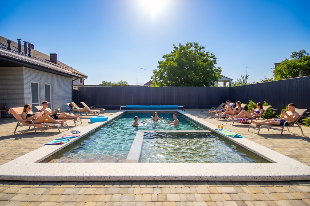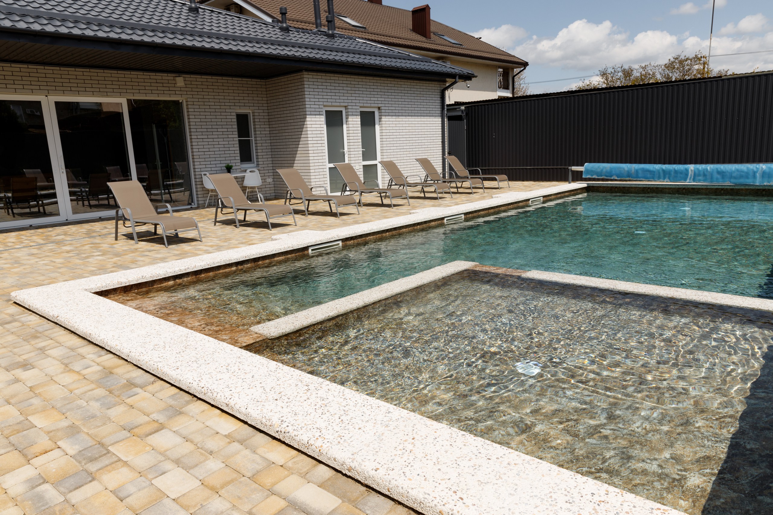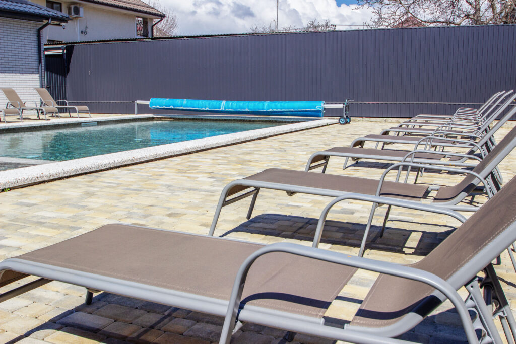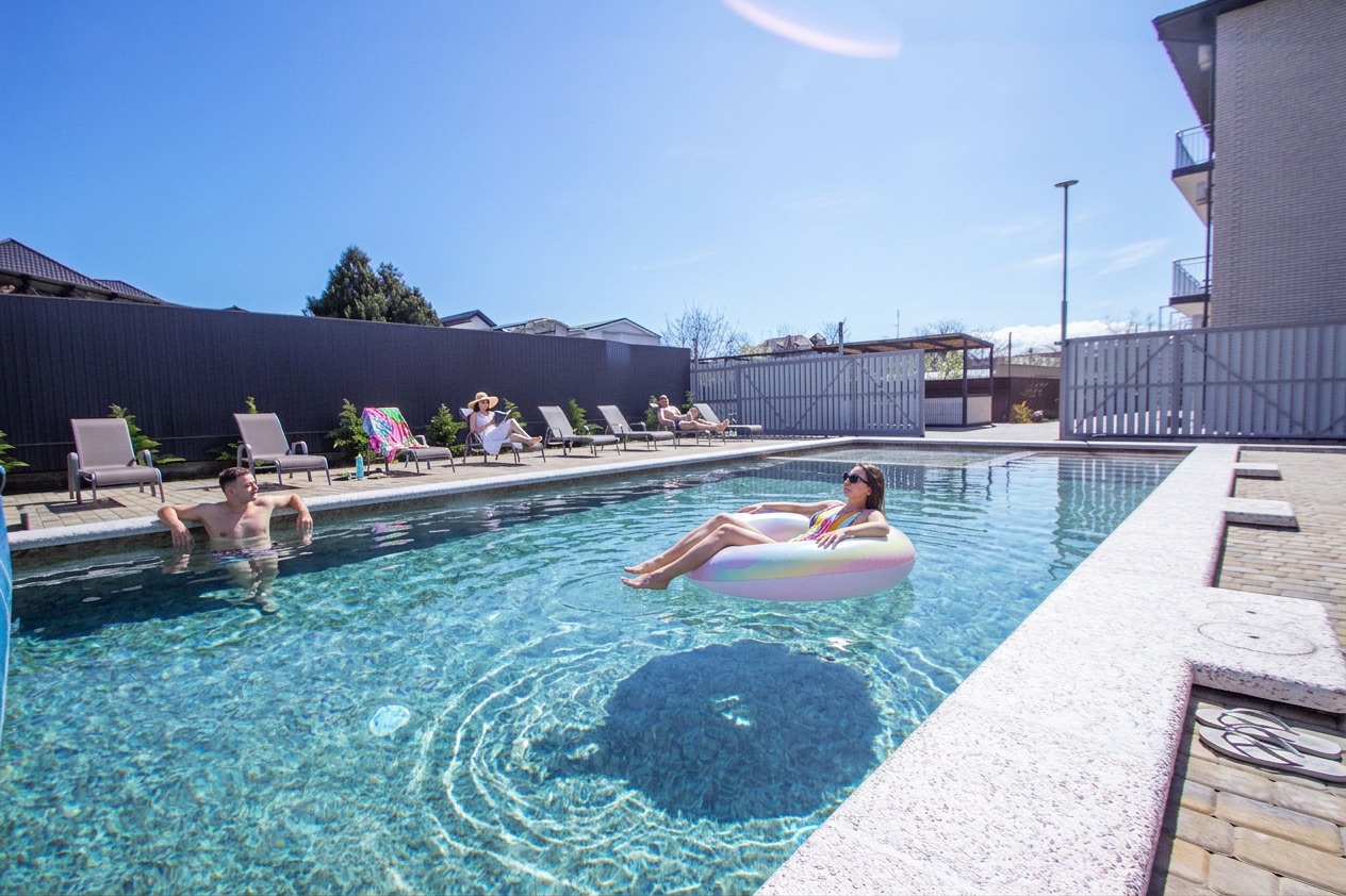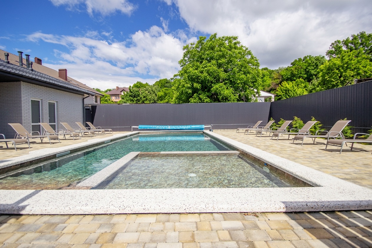 Особенностью является просторный бассейн, окружённый зелёной зоной отдыха. Здесь вы сможете расслабиться в тёплые солнечные дни, освежиться прохладной водой и зарядиться энергией солнца. Для вашего удобства рядом установлены шезлонги, столики и зонтик, чтобы отдых стал комфортным и приятным.