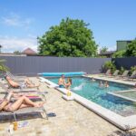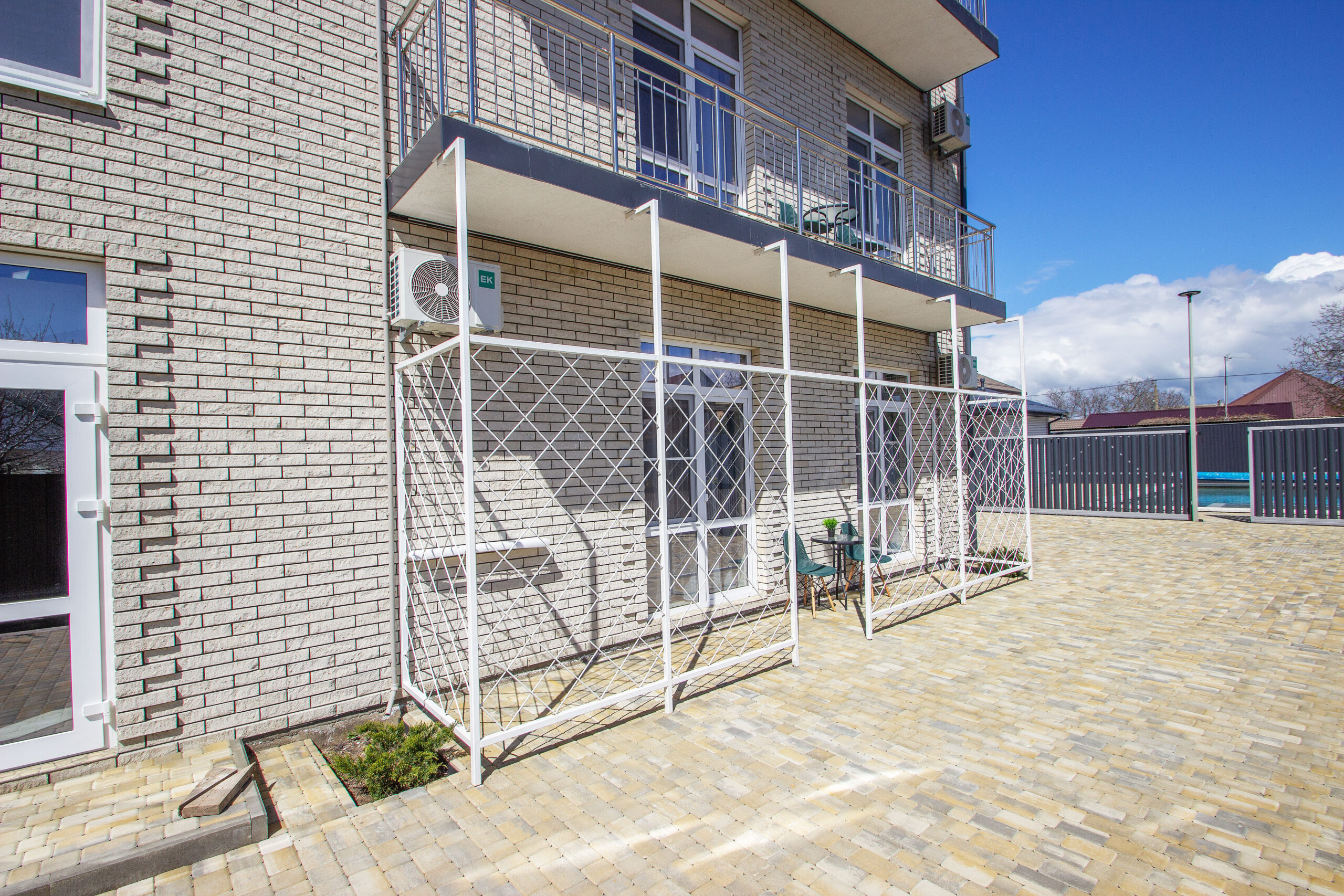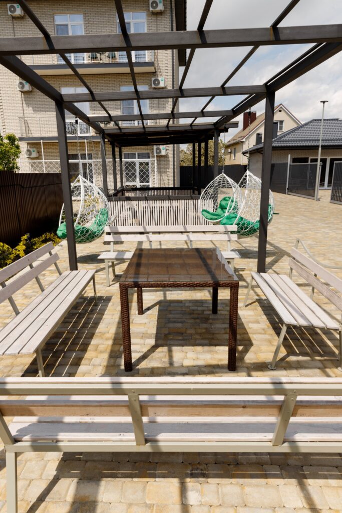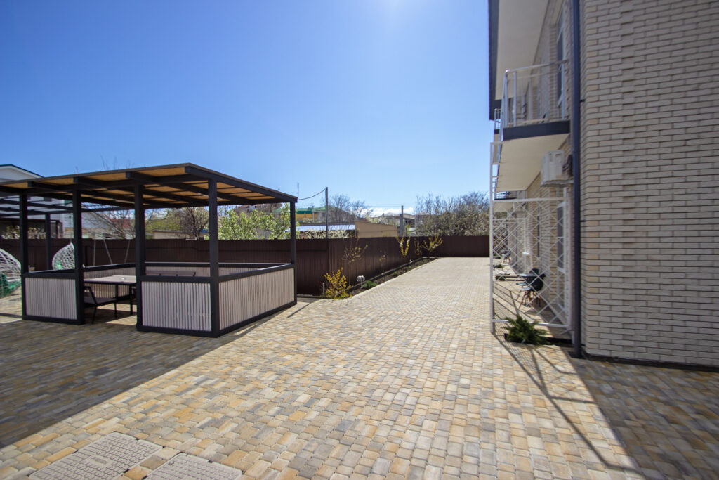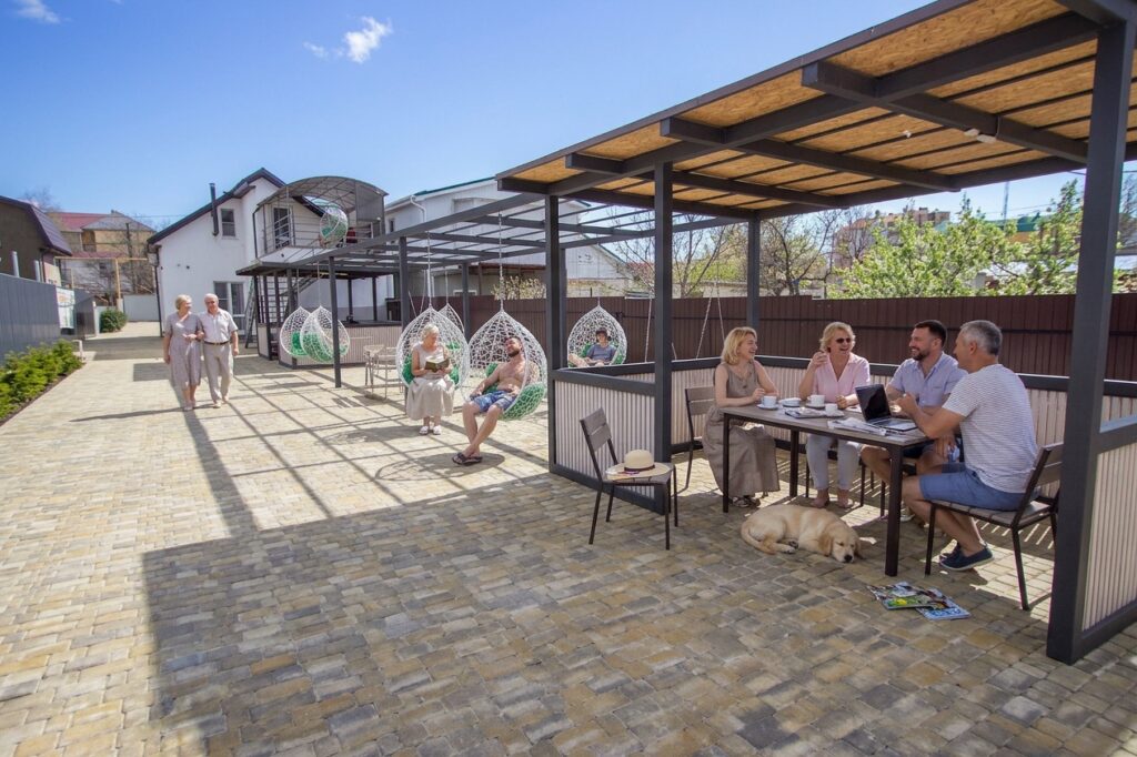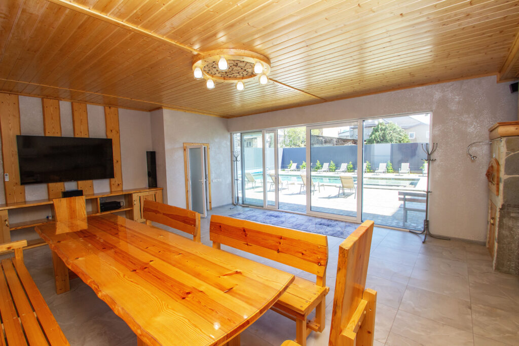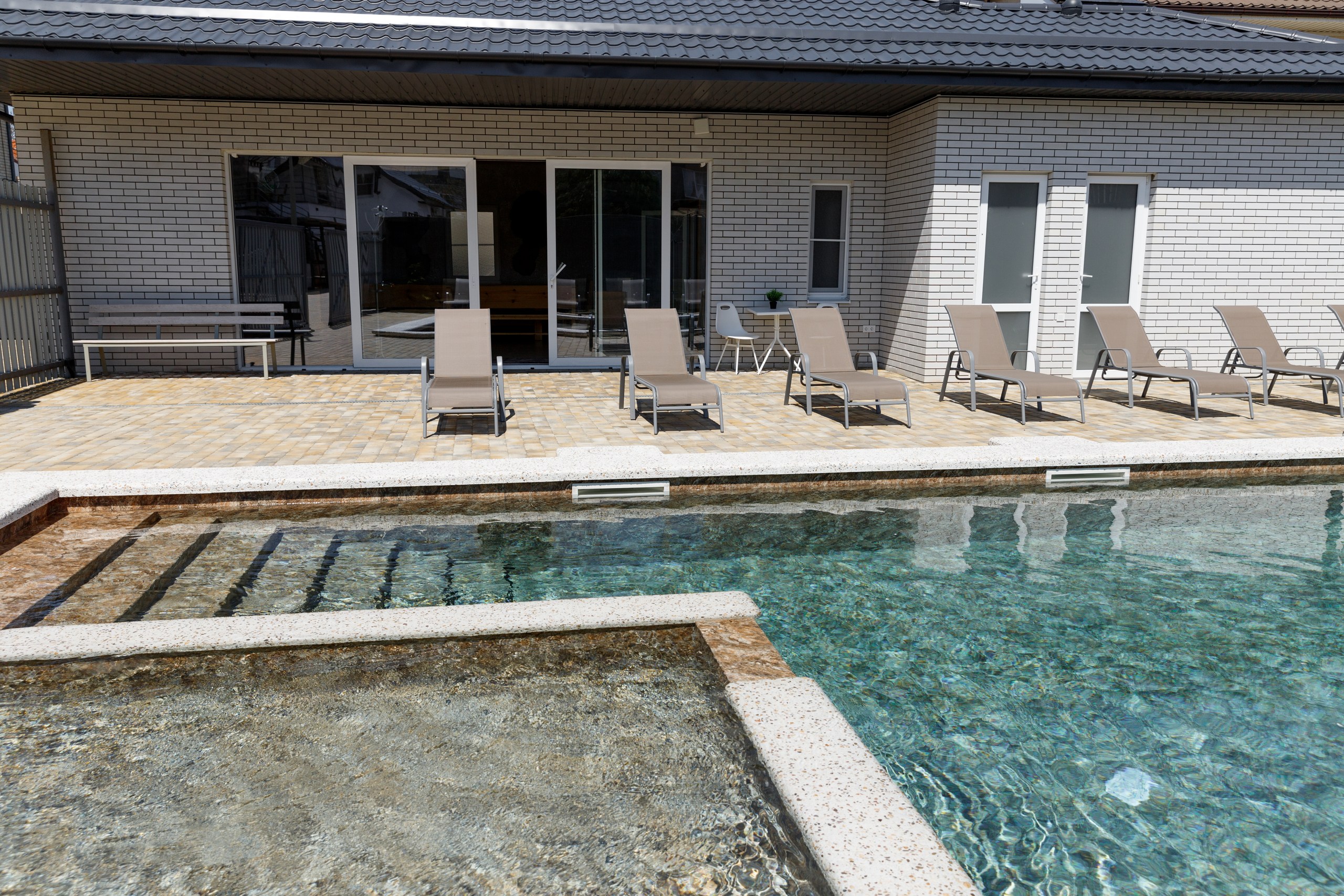 Особенностью является просторный бассейн, окружённый зелёной зоной отдыха. Здесь вы сможете расслабиться в тёплые солнечные дни, освежиться прохладной водой и зарядиться энергией солнца. Для вашего удобства рядом установлены шезлонги, столики и зонтик, чтобы отдых стал комфортным и приятным.